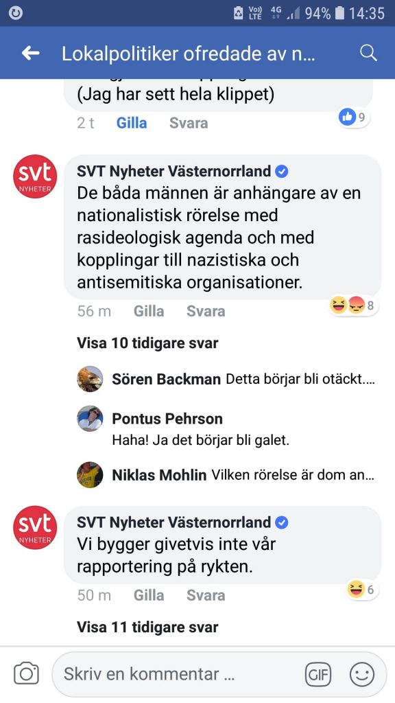 Efter detta samtal händer en hel del. Under lördagen har SVT Västernorrland publicerat artiklarna på sin Facebooksida och kritiska kommentarer börjar droppa in där. Då gör SVT Västernorrland något oerhört och ger sitt stöd till de grundlösa påståendena om Marcus och Mathias, och har dessutom mage att slå sig på bröstet om att deras rapportering inte byggs på rykten.